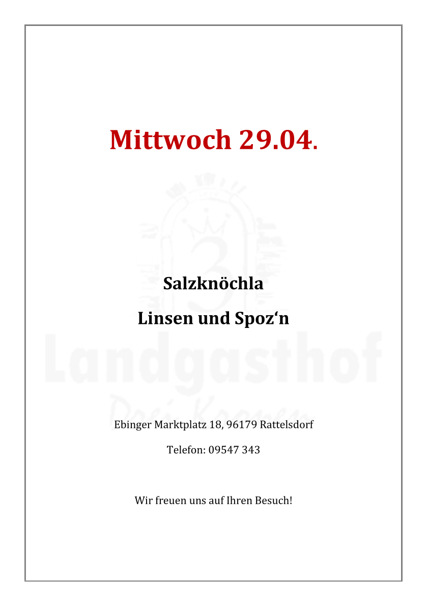 Freitag (01.05.26), Sonntag (03.05. + 10.05.26), Donnerstag (04.06.26) Mittagstisch ab 11 Uhr